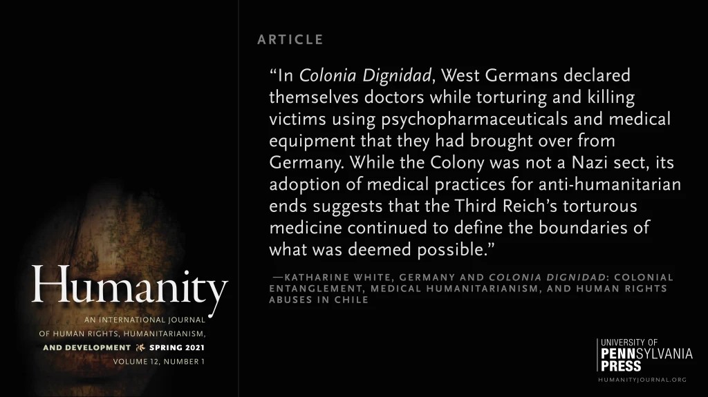 “Germany and Colonia Dignidad: Colonial Entanglement, Medical Humanitarianism, and Human Rights Abuses in Chile,” Humanity Journal 12, 1 (spring 2021): 20-38. You can access it here.
